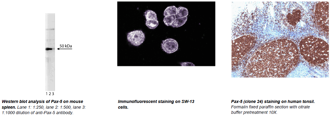 during embryogenesis. Expression then shifts to the fetal liver and correlates with the onset of B lymphopoiesis. Pax-5 has been found to be