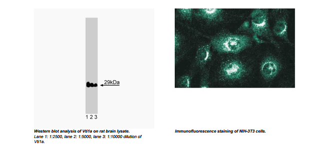 Eukaryotic protein trafficking involves the packaging of molecules into membranous vesicles that bud from a donor compartment, travel to a specific destination, fuse, and release their components into an acceptor compartment. Recognition between vesicle and acceptor membrane is mediated by the pairing of the integral membrane SNARE proteins. The stable interaction between vesicle proteins (v-SNAREs) and target proteins (t-SNAREs) juxtaposes the membranes and results in an activated docked state and/or membrane fusion. VTI1a and VTI1b are putative mammalian SNARE proteins identified by sequence comparison with yeast SNAREs. In line with their involvement in vesicle transport, these molecules are expressed in a wide range of mammalian tissues. Vti1a, a possible t-SNARE, contains a C-terminal hydrophobic domain and several regions that may form coiled-coil structures. It exists in distinct syntaxin 5- and syntaxin 6-containing SNARE complexes within the Golgi apparatus. Inhibition of Vti1a blocks transport of G proteins to the cell surface and results in their accumulation within the Golgi. Thus, Vti1a functions in protein transport within the secretory pathway.