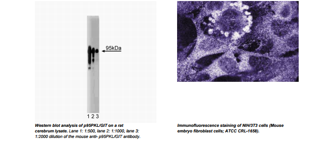 Paxillin is involved in the integration of growth factor- and adhesion-mediated signal transduction pathways at focal adhesion sites. The LD motif of paxillin has been implicated in its binding to FAK, vinculin, and paxillin-kinase linker (p95PKL). p95PKL couples paxillin to a protein complex containing p21 GTPase-activated kinase (PAK), Nck, and the guanine nucleotide exchange factor, PIX. The sequence of p95PKL, highly homologous to human GIT1 and GIT2, predicts a structure that contains an N-terminal ARF-GAP domain containing a Zn2+ finger, three ankyrin repeats, an EF hand domain, and two IQ motifs. p95PKL binds to both paxillin and PIX and colocalizes with paxillin at focal adhesion sites. Overexpression of a paxillin LD4 deletion mutant in neuroblastoma cells inhibits insulin-like growth factor-1 mediated lamellipodia formation. Microinjection of this mutant into NIH3T3 cells has been reported to decrease migration into a wound. These alterations in cell motility are thought to involve PAK-mediated regulation of the actin cytoskeleton, since the LD4 motif of paxillin is required for p95PKL-dependent recruitment of PAK/PIX complexes to paxillin-containing focal adhesions sites. This antibody has been reported to recognize GIT1 and GIT2 proteins.