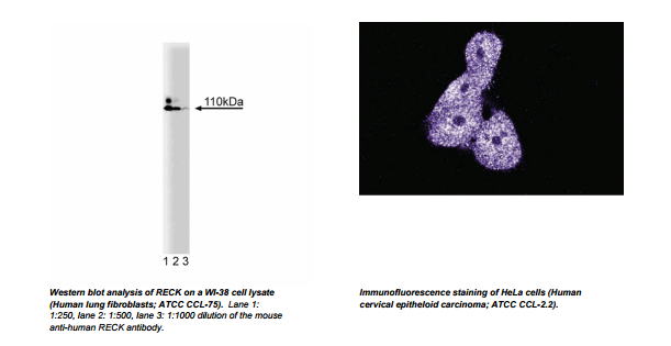 eversion-inducing-cysteine-rich protein with Kazal motifs (RECK) was identified in an assay that characterized genes inducing flat morphology in a v-Ki-ras-transformed NIH 3T3 cell line. RECK is a glycoprotein that contains two hydrophobic regions, the C-terminal is involved in GPI-anchoring, five repeats of a putative six-cysteine knot motif, two EGF-like regions (E), and three serine-protease inhibitor-like domains (S), one of which (635-654) is a Kazal motif (C-X7-C-X6-Y-X3-C-X2.3-C). In normal human tissues, RECK is expressed ubiquitously, however it is not detectable in many malignant cell lines. Downregulation of RECK transcription in malignant cells may involve ras-dependent negative regulation of the RECK gene via an upstream promoter region that contains an Sp1 motif. Transfection of tumor cell lines with RECK can inhibit tumor invasion and metastatic activity independent of chemotactic activity. This inhibitory effect may be a result RECK-induced inhibition of MMP-9 secretion or protease activity. Thus, RECK may be an important inhibitor of matrix metalloproteinase activity and suppression of RECK may be required for both tumor cell invasion and metastasis.