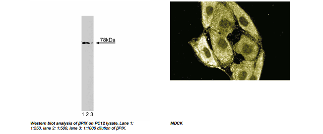 The activity of PAK family kinases is regulated through interaction with the small GTPases Cdc42 and Rac1. PAKs are activated by the GTP-bound form of Cdc-42 and Rac1, and recruitment of PAKs to focal complexes has been implicated in Cdc42- and Rac1-dependent regulation of focal contact formation. PAK-interacting exchange factor (PIX) was identified in a screen for proteins that bind PAKs. Two forms of PIX have been identified: an 85 kDa protein designated αPIX and a 78 kDa protein designated βPIX. These proteins have 80% identity in their overlapping regions, which include myosin-like, pleckstrin (PH), Dbl (DH), and SH3 domains. In addition, αPIX contains a calponin-like domain at the N-terminus. The expression of βPIX is ubiquitous, while αPIX is expressed in heart, muscle, and thymus. PIX can act as a guanine nuleotide exchange factor for Rac1 and co-transfection of βPIX, Cdc42, and αPAK results in increased αPAK activity. PIX binding to PAK is required for localization of PAKs to focal complexes and injection of βPIX leads to rac1-dependent membrane ruffling. Thus, PIX is important for PAK localization and activity during small GTPase-dependent regulation of cell morphology.