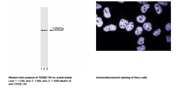 Tightly associated factors (TAFs) play an essential role in transcriptional activation through their interaction with a variety of activators. TAF[II]135 (a.k.a. TAF[II]130) is a human homologue of Drosophila TAF[II]110, the first TAF shown to have coactivator activity. TAF[II]135 contains multiple glutamine-rich regions, as well as a coactivator domain (CAD). The glutamine-rich regions of TAF[II]135 facilitate interaction with Sp1 and CREB, which leads to enhancement of both Sp1- and CREB-mediated transcription. In addition, TAF[II]135 can potentiate transcriptional stimulation by AF-2 of the retinoic acid, thyroid hormone, and vitamine D3 receptors. However, TAF[II]135 does not interact with the AF-2s of the estrogen and retinoid X receptors. Interestingly, TAF[II]135 enhancement of CREB transcriptional activity may be disrupted by expanded polyglutamine (CAG) repeats found in at least eight different neurodegenerative disorders. Thus, TAF[II]135 may have important coactivator activities in many different transcription-regulating cell signaling pathways, and interference of TAF[II]135 activity by CAG repeats may be a common mechanism of specific types of neuropathologies.