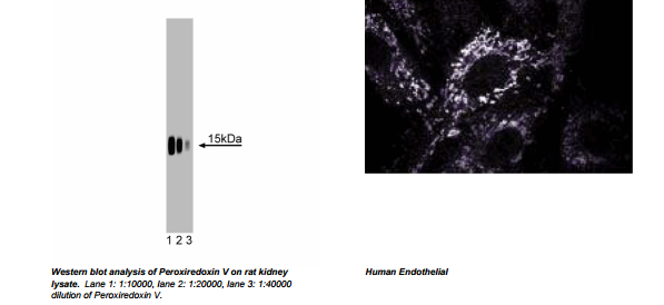 Peroxisomes, ubiquitous organelles of eukaryotic cells, are involved in a number of metabolic processes. Their formation involves membrane generation, targeting and insertion of peroxisomal membrane proteins (PMPs) into the membrane, and transport of matrix proteins across the newly formed membrane. Peroxiredoxins are a family of peroxisomal proteins that includes peroxiredoxin I, II, III, IV, and V. These proteins are homologous to thioredoxin peroxidase, and have been implicated in the reduction of H2O2 levels. Peroxiredoxin V (aka AOEB166/PMP20) is a widely expressed peroxisome matrix protein that contains a C-terminal peroxisomal targeting signal 1 that facilitates binding to the PTS1 receptor, PEX5. Peroxiredoxin V is localized to the cytoplasm and peroxisomes, and displays thiol-specific antioxidant activity in vitro . In rat lung, acute inflammation induced by LPS is associated with an increase in Peroxiredoxin V mRNA levels. Other peroxiredoxins have been shown to reduce the amount of H2O2-induced apoptosis when overexpressed. Similarly, overexpression of Peroxiredoxin V inhibits p53-induced apoptosis. Thus, peroxiredoxin V may be an important anti-apoptotic enzyme found in peroxisomes.