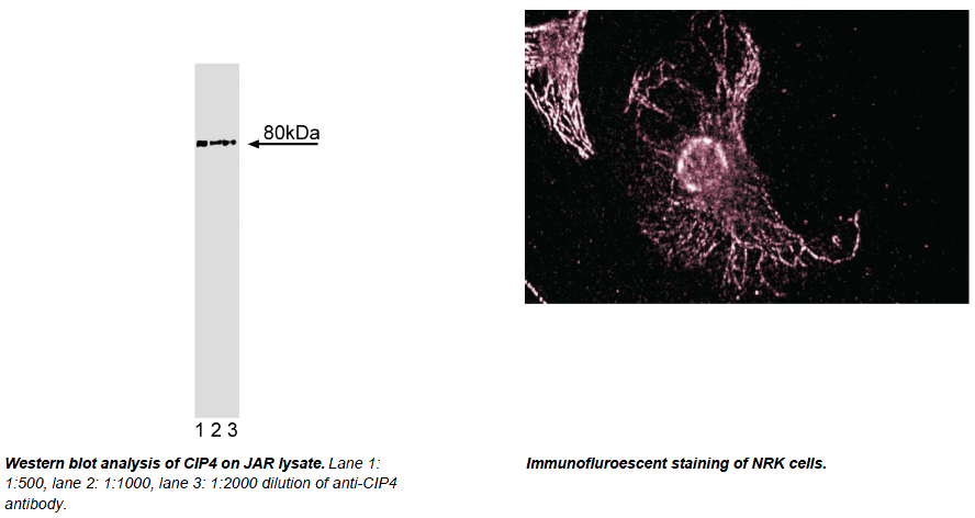 highest in skeletal muscle, heart, and placenta. Overexpression of CIP4 in Swiss 3T3 cells reduces the amount of stress fibers and leads to
