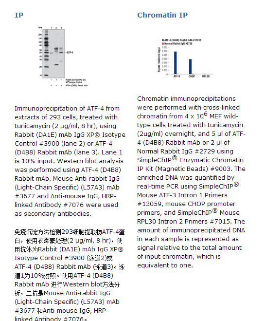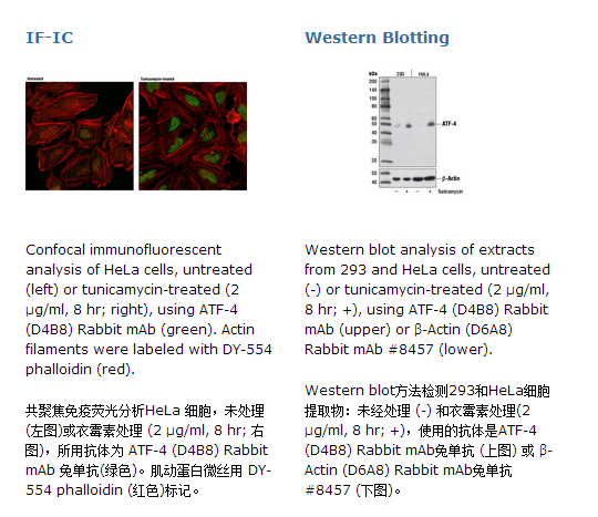 ATF-4 (D4B8) Rabbit mAb能够检测内源性ATF-4总蛋白水平。