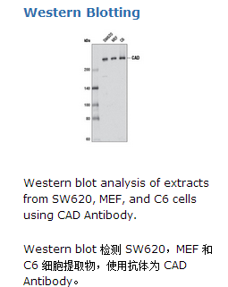 CAD Antibody能够检测内源性CAD总蛋白水平。在一些细胞系中该抗体可能会某未知来源~45 kDa蛋白产生交叉反应。该多克隆抗体是由合成的人源CAD蛋白C末端肽段免疫动物而制备的。抗体由protein A和肽亲和层析技术纯化。