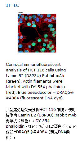 Lamin B2 (D8P3U) Rabbit mAb 兔单抗能够检测内源性的 lamin B2 总蛋白。该单克隆抗体是采用合成的人源lamin B2蛋白Lys415 周围残基相对应的肽段免疫动物而制备的。抗体由protein A和肽亲和层析技术纯化。核纤层蛋白Lamin是核膜结构的组分,对维持正常的细胞功能非常重要,例如细胞周期控制、DNA修复和染色质组装(1-3)。Lamins 已细分为A和B型。A型核纤层蛋白由核纤层蛋白A和C组成,来源于选择性剪接。Lamin A/C 能够被剪切成特异的大片段(41-50 kDa)和小片段 (28 kDa) ,这是细胞凋亡的标志(4,5)。B型核纤层蛋白由核纤层蛋白B1和B2组成,由单独的基因编码(6-8)。在细胞凋亡时,核纤层蛋白B1也被半胱天冬酶酶切(9)。研究显示,核纤层蛋白B1基因的复制,与神经功能紊乱并在成年期发病的脑白质病变的发病机制相关(10)。核纤层蛋白B2基因敲除小鼠在神经元发育有缺陷(11),这与核纤层蛋白B1基因敲除小鼠不同(12)。