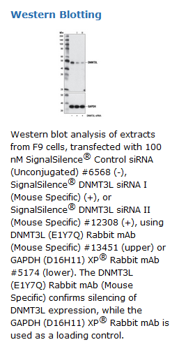 SignalSilence® DNMT3L siRNA I (Mouse Specific) from Cell Signaling Technology (CST) allows the researcher to specifically inhibit DNMT3L expression using RNA interference, a method whereby gene expression can be selectively silenced through the delivery of double stranded RNA molecules into the cell. All SignalSilence® siRNA products from CST are rigorously tested in-house and have been shown to reduce target protein expression by western analysis.