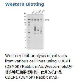 CDCP1 (D8M5K) Rabbit mAb用于检测内源性的CDCP1总蛋白。该单克隆抗体可以识别CDCP1细胞外结构域的一个表位。该单克隆抗体由CDCP1蛋白Ala354附近残基合成的多肽免疫动物产生。CDCP1(CUB结构域包含蛋白, SIMA135)可能是一种干细胞的标记物,于多种研究中被发现在人癌细胞、典型和非典型结肠癌中高度表达(1)。CDCP1的表达可能受到表观遗传学调节,因为启动子CpG序列的甲基化可以导致CDCP1表达减少(2)。CDCP1的基因也编码由多种结构域形成的跨膜糖蛋白复合物抗原。3种胞外区的CUB结构域有可能在细胞粘附或细胞外基质相互作用中起作用(1,3)。Src-家族激酶可能磷酸化CDCP1胞浆区第5位的酪氨酸残基从而为包含SH2结构域的蛋白提供结合位点(3)。CDCP1可能是一种造血干细胞标记物(4,5)。