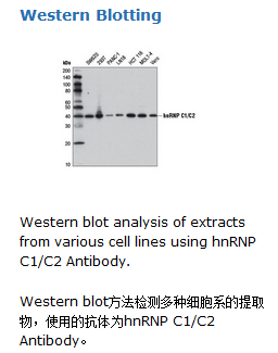 hnRNP C1/C2 Antibody recognizes endogenous levels of total hnRNP C1/C2 protein. This antibody does not cross-react with other hnRNPCL1 or RALY proteins.