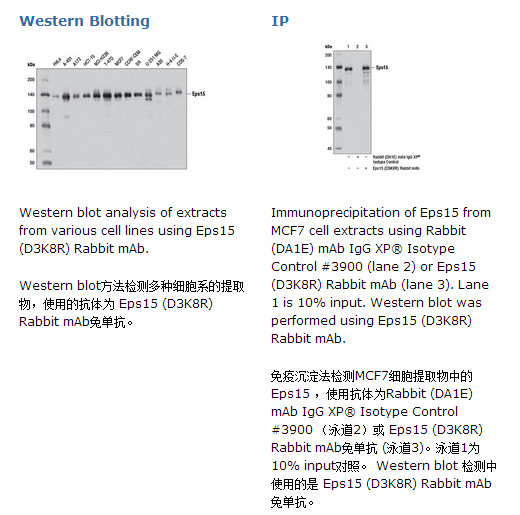 Eps15 (D3K8R) Rabbit mAb兔单抗能够检测内源性的Eps15总蛋白。 基于序列比对分析,该抗体可能会与 Eps15a 和Eps15b发生交叉反应。但不会与 Eps15R发生交叉反应。该单克隆抗体是经由合成的围绕人 Eps15 蛋白 Pro630的氨基酸肽段免疫动物而生产的。Eps15(EGFR通路底物15)首先被发现作为EGFR激酶活性的底物(1)。Eps15有三部分结构,氨基末端部分包含三个进化上保守的EH蛋白-蛋白相互作用区域,中央部分推测的卷曲螺旋区域,为组成性寡聚化所需,羧基末端区域包含多个天冬氨酸-脯氨酸-苯丙氨酸三联重复,组成AP2结合域。羧基末端也包含两个泛素相互作用基序(UIM),其中后一个为Eps15与泛素结合所不可缺少的(1)。若干证据支持Eps15在clathrin介导的内吞中发挥作用,包括突出囊泡的内吞。Eps15像结合其它涉及内吞或突触囊泡回收蛋白如synaptojanin1和epsin一样结合到AP-2。另外,Eps15与质膜clathrin包被的小凹和囊泡标志物共定位(2)。的确,Eps15被显示出调节内体的c-Met(3)和EGFR(4)转运,可能是通过其UIM与泛素标签相互作用招募这些泛素化的受体到clathrin包被小凹的边缘来完成这一功能。EPS15基因产生两种亚型,被认为分别定位于不同的亚细胞结构,并且可能与内体转运的不同方面有关(5)。人EPS15被定位于染色体1p31-p32,此区域常显示出若干非随机的染色体异常,包括神经母细胞瘤中的缺失、急性淋巴细胞和髓系白血病中的转位。两个t(1;11)(p32;q11)转位在罕见的髓系白血病中被描述,它会造成Eps15基因与HRX基因融合(6)。