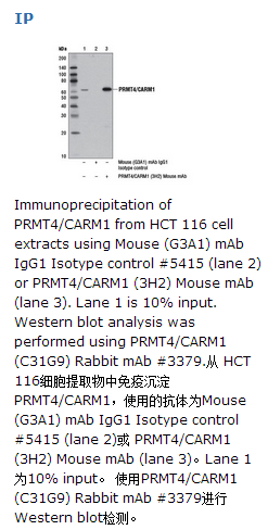 PRMT4/CARM1 (3H2) Mouse mAb鼠单抗能够检测内源性PRMT4/CARM1 总蛋白水平。该单克隆抗体经是采用合成的人CARM1重组蛋白免疫动物而生产的。Protein arginine N-methyltransferase 4 (PRMT4)是蛋白精氨酸甲基转移酶(PRMT)蛋白家族的一个成员,它以S-腺苷-甲硫氨酸(S-adenosylmethionine,AdoMet)为甲基供体,把甲基转移到蛋白精氨酸胍基的氮原子上 (1)。尽管所有的PRMT蛋白都能催化单甲基精氨酸的形成,但Type I PRMTs (PRMT1, 3, 4, 和 6)能够添加另一个甲基基团从而产生一个不对称的二甲基化精氨酸,而Type II PRMTs (PRMT 5 and 7)则能产生一个对称的二甲基精氨酸(1)。单甲基化精氨酸,而非二甲基化精氨酸可以通过由类似PADI4这样的酶催化的脱氨基作用来转变为瓜氨酸(2)。大部分PRMT包括PRMT1,能够甲基化在富含甘氨酸 - 精氨酸(GAR)的蛋白结构域内发现的精氨酸残基,例如RGG, RG, 和 RXR重复序列中 (1)。然而,PRMT4/CARM1 和 PRMT5可以使PGM (proline-, glycine-, methionine-rich) 结构中精氨酸甲基化(3)。PRMT1能够甲基化组蛋白H4的Arg3 位点,并且能够与p300/CBP协同作用通过核受体蛋白来增强转录激活(4-6)。此外,PRMT1能够甲基化组非组蛋白,包括孤儿核受体HNF4(6)、不均一核糖核蛋白(hnRNP)颗粒的组分(7)、RNA结合蛋白Sam68(8)、白介素增强子结合因子3(ILF3)(9)以及干扰素-α 和 β受体(10)。这些相互作用暗示着PRMT1在转录调控、mRNA加工和信号转导还有一些其他的功能。可变RNA剪接会产生3种氨基末端区域不一样的酶促激活PMRT1异构体(11)。PRMT1根据不同的细胞类型会定位在和或者细胞质中(12,13),同时会在许多不同的蛋白复合物中出现。ILF3、TIS21以及白血病相关性BTG1蛋白能够结合PRMT1从而条龙其甲基转移酶活性(9,14)。