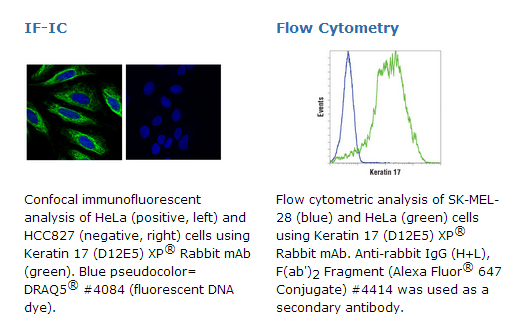 Keratin 17 (D12E5) XP® Rabbit mAb recognizes endogenous levels of total keratin 17 protein.