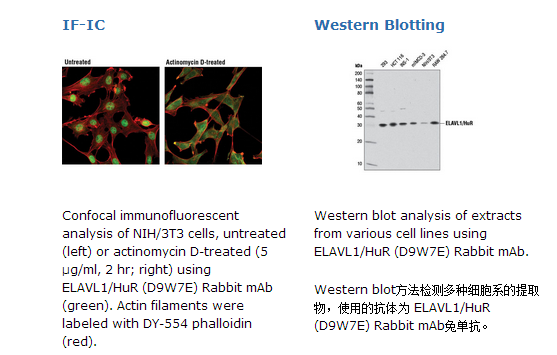 ELAVL1/HuR (D9W7E) Rabbit mAb兔单抗能够检测内源性 ELAVL1/HuR总蛋白水平。该单克隆抗体是经由合成的围绕人ELAVL1/HuR蛋白 His201位点的氨基酸肽段免疫动物而生产的。ELAVL (embryonic lethal, abnormal vision and Drosophila-like)蛋白家族包括ELAVL1/HuR, ELAVL2/HuB, ELAVL3/HuC 和 ELAVL4/HuD (1)。ELAVL1/HuR广泛表达而且其他三个成员的表达是神经元特异性的91)。 ELAVL/Hu蛋白是高度保守的RNA结合蛋白(1)。除了三个RNA识别基序外,这些蛋白还含有一个核定位信号,能够使他们在核和胞质间穿梭(2)。当用actinomycin D抑制转录时,ELAVL1/HuR会从核内重新定位于胞质内并在这里与mRNA 3' UTR上的AU-rich element结合从而稳定mRNA(3,4)。ELAVL1/HuR被认为可以通过结合mRNA来提高翻译(5,6)。另外ELAVL1/HuR 还能够与microRNA(miRNA)相互作用(7)。