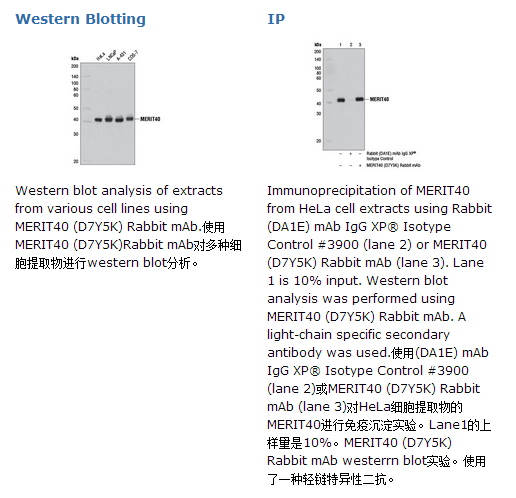 MERIT40 (D7Y5K)Rabbit mAb可以识别内源性总的MERIT40蛋白。单克隆抗体由合成肽段免疫动物产生,该肽段与人MERIT40蛋白的羧基端一致。乳腺癌易感基因,BRCA1,编码一种E3泛素连接酶,BRCA1通过调控DNA损伤反应和DNA修复维持基因组的稳定性。BRCA1会和其他DNA损伤蛋白结合形成至少三种不同的复合物(BRCA1A,B和C),这种结合对于调控BRCA1的功能是至关重要的。BRCA1-Rap80 复合物 (BRCA1 A复合物),包括Rap80, BRCC36, BRCC45, Abraxas, 和MERIT40/NBA1,调控G2/M周期检验点(1,2)。MERIT40/NBA1定位于DNA损伤的部位,对于维持电离辐射后引发的BRCA1反应及其正确定位,以及维持BRCA1复合物都是必须的(3.4)。蛋白组学研究发现MERIT40/NBA1的29位丝氨酸可以被磷酸化,该磷酸化的重要性尚待研究(5-9)。