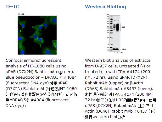 uPAR (D7X2N) Rabbit mAb可以识别内源性总的uPAR蛋白。单克隆抗体由合成肽段免疫动物产生,该肽段与人uPAR蛋白Arg303 附近氨基酸一致。人体尿激酶型纤溶酶原激活物受体(uPAR的)是一个55-65 kDa的,高度糖基化,GPI锚定的细胞表面受体(去糖基化蛋白质为35 kDa)(1-3)。它是纤溶酶原激活通路的核心成员。uPAR高亲和地与丝氨酸蛋白酶尿激酶型纤溶酶原激活剂(uPA)结合并在细胞表面上以空间限制的方式将纤溶酶原转化为活性形式的纤维蛋白溶酶(4)。纤维蛋白溶酶进一步激活uPA,这是由丝氨酸蛋白酶抑制剂所抑制的,例如纤溶酶原激活物抑制剂(5)。因此,uPAR在调控细胞外蛋白水解的过程中发挥了关键作用。此外,uPAR还调节了细胞增殖,黏附和运动(6,7)。研究表明多种癌细胞和组织中uPAR都是过表达的(8,9)。
