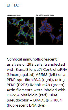 PFKP (D2E5) Rabbit mAb兔单抗能够检测内源性PFKP总蛋白水平。该单克隆抗体是由合成的人源PFKP蛋白N末端肽段免疫动物制备的。磷酸果糖激酶(PFK)在糖酵解过程中催化6-磷酸果糖的磷酸化(1)。它有三种同工酶:肌肉型,肝脏型和血小板型(2,3)。血小板型的磷酸果糖激酶(PFKP)在多种细胞中表达(4,5)。研究发现,幼龄时发生PFKP基因变异的个体在成年后易患肥胖和糖尿病(6)。