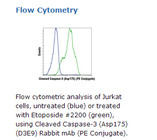 Cleaved Caspase-3 (Asp175) (D3E9) Rabbit mAb (PE Conjugate) recognizes endogenous levels of caspase-3 protein only when cleaved at Asp175.
