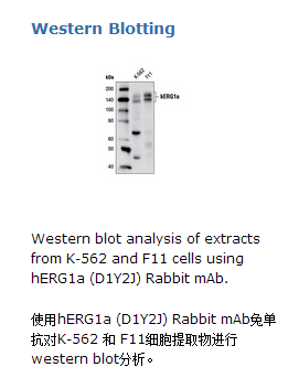 hERG1a (D1Y2J) Rabbit mAb兔单抗可以识别内源性成熟和未成熟的hERG1a蛋白水平。该抗体会在某些细胞系与未知源性的蛋白在65和42kDa处产生条带。抗体不识别hERG1b蛋白。单克隆抗体由合成肽段免疫动物产生,该肽段与人hERG1a蛋白Ala223附近氨基酸一致。hERG1(human ether-a-go-go-related gene potassium channel 1)是一个电压门控钾通道alpha-亚蛋白,介导了心脏延迟整流钾电流的快速激活元件(IKr) (1,2)。hERG通道由两个亚基组成,1a和1b,是由可变剪接导致的氨基端序列不同。原生hERG通道由hERG1a和 hERG1b异聚体形成。两个亚基都会有助于IKr电流(3-6)。化合物或hERG编码基因KCNH2突变诱导的hERG阻断会导致室性心律失常伴随遗传性和获得性长QT综合征和心肌细胞凋亡(7-10)。因此,hERG通道是发展III型抗心律失常药物的原始靶点(11,12)。hERG通道也被多种非抗心律失常化合物抑制,并导致副作用。因此,在为多种疾病选择治疗药物时hERG通道阻断是一种常见的衡量标准(11,13,14)。研究表明hERG参与了癌细胞存活(15)。在正常成年人组织中,hERG表达在心脏,脑,子宫肌层,胰腺和造血祖细胞(16,17)。hERG也表达在上皮细胞,神经细胞,白血病,结缔组织起源的多种肿瘤细胞系,但不在正常细胞中表达(18-22)。此外,hERG的表达与增强癌细胞的增殖,侵袭,较差预后相关联(23,24)。