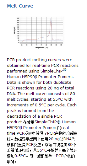 SimpleChIP® Human HSP90β Promoter Primers包含一对正向和反向PCR引物,该引物特异性针对人HSP90β启动子上的一段序列,能用来扩增用染色质免疫沉淀法(ChIP)分离的DNA。该引物已经用SYBR® Green quantitative real-time PCR进行优化,并且用SimpleChIP® Enzymatic Chromatin IP Kits #9002 and #9003 和CST公司的ChIP验证抗体进行测试。HSP90β是基本的细胞质HSP90蛋白,作为内质网上的分子伴侣。它参与自发性及适应性免疫的细胞折叠。1.标签适当数量的PCR管或与实时定量PCR仪兼容的PCR板。PCR反应应重复执行,应该包括一个管没有DNA作为对照,和一系列不同浓度2%的总染色质DNA(1:5,1:25,1:125),用于创建一个标准曲线并明确扩增效率。2.在每一个管或PCR板孔中添加2μl合适的ChIP DNA样本。3.准备一个PCR反应体系如下所述。考虑到体积的损失可额外添加足够两个反应的试剂。在每个PCR反应管或PCR板孔中添加18μl PCR反应混合体。一个 PCR反应(20μl)的试剂体积Nuclease-free水6μl,5μM SimpleChIP® Primers 2 2μl,2 x SYBR®Green Reaction Mix 10μl4. 开始PCR反应程序如下:初始变性:95°C 3分钟。b.变性:95°C,持续15秒。C.退火和延伸:引物特异性温度,60秒。d.重复步骤b和c总共40周期。5.使用实时PCR仪提供的软件分析定量PCR的结果。染色质免疫沉淀(chromatin immunoprecipitation ,ChIP)分析是一个有力且通用的技术,能用来探测细胞内天然染色质环境中的蛋白质-DNA相互作用(1,2)。这种分析能用于鉴定多种与基因组某个特定区域相关的蛋白,或者鉴定基因组中许多与某种特殊蛋白结合的区域(3-6)。ChIP能确定募集到基因启动子的多种蛋白的特异的顺序,或者“度量”整个基因位点特定的组蛋白修饰的相对数量 (3,4)。除了组蛋白外,ChIP还能用于分析转录因子与辅助因子、DNA复制因子和DNA修复蛋白的结合。当进行ChIP 分析时,细胞首先用甲醛固定,甲醛是一种可逆的蛋白质-DNA交联剂,它可以“保存”在细胞内进行的蛋白质-DNA相互作用 (1,2)。然后将细胞裂解,收集染色质并用超声波或酶消化成片段,片段的染色质用特异性针对特定蛋白或组蛋白修饰的抗体进行免疫沉淀。任何与蛋白或有关组蛋白修饰相关的DNA序列都会作为交联染色质复合物的一部分与其共沉淀,并且该DNA序列的相对数量会在免疫选择过程中增加。在免疫沉淀之后,蛋白质-DNA交联将逆转,DNA就被纯化了。标准PCR或实时定量PCR经常用于测量进行蛋白质特异免疫沉淀后特定DNA序列的富集量(1,2)。另外,ChIP分析能选择性地与基因组微阵列技术 (ChIP on chip)、高通量测序技术(ChIP-Seq)或克隆策略相结合,它们都能进行蛋白质-DNA相互作用和组蛋白修饰的全基因组分析(5-8)。经过实时定量PCR优化,SimpleChIP® primers是ChIP分离的DNA扩增的最佳引物,并且提供用于确认一个成功的ChIP实验的阳性对照和阴性对照。