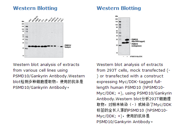 PSMD10/Gankyrin 抗体识别内源性的PSMD10/Gankyrin总蛋白。多克隆抗体通过合成与人源PSMD10/Gankyrin蛋白羰基末端邻近氨基酸残基序列一致的肽段,免疫动物产生。抗体经Protein A和肽亲和层析纯化。PSMD10 / Gankyrin是锚蛋白重复伴侣蛋白,参与蛋白酶体19S RP的组装(1)。研究已经证明,PSMD10是原癌基因,在肝细胞癌中过表达(2)。调查相信PSMD10的致癌性可能与其结合和调节pRB, CDK4, MDM2, RelA稳定性与活性的能力有关(2-5)。