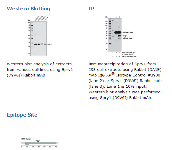 Spry1 (D9V6I) Rabbit mAb recognizes endogenous levels of total Spry1 protein. This antibody may also cross-react with an unidentified protein at 65 kDa.