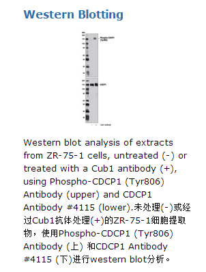 Phospho-CDCP1 (Tyr806) Antibody recognizes endogenous levels of CDCP1 protein only when phosphorylated at Tyr806. This antibody does not cross-react with CDCP1 phosphorylated at Tyr707, Tyr734, or Tyr743, but may cross-react with other phospho-tyrosine containing proteins.