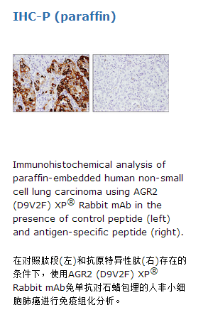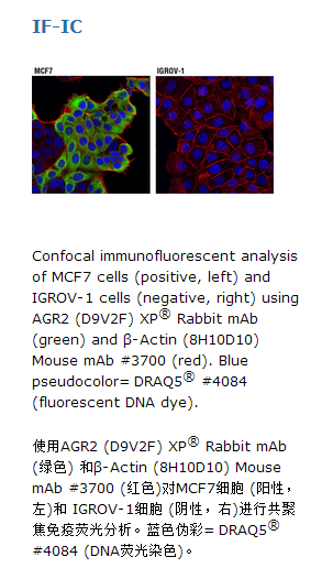 AGR2 (D9V2F) XP® Rabbit mAb可以识别内源性的总AGR2蛋白。此单克隆抗体由合成肽段免疫动物产生,该肽段与人AGR2蛋白的Ala29邻近氨基酸残基序列一致.Anterior gradient homolog 2 (AGR2)是蛋白质二硫键异构酶(PDI)家族成员,是非洲爪蟾cement gland蛋白的同源物(1)。在正常人组织中,AGR2主要表达在小肠细胞中。它也在一些恶性腺瘤中过表达,包括乳腺癌、胰腺癌、卵巢癌、前列腺癌和食管癌(2-4)。体外和体内试验表明AGR2正向调控细胞生长和分裂,过表达AGR2可以促进细胞的转化(5,6)。AGR2还涉及了YAP1介导的双调蛋白表达上调,提示AGR2在EGF和Hippo 激酶通路中有发挥作用(6)。