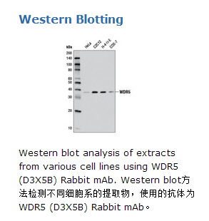 WDR5 (D3X5B) Rabbit mAb兔单抗能够检测内源性WDR5总蛋白水平。该单克隆抗体是采用合成的与人源WDR5蛋白Pro30残基周围序列相对应的肽段免疫动物而生产的。Set1组蛋白甲基转移酶蛋白首次在酵母中被确认,作为Set1/COMPASS组蛋白甲基转移酶复合物的一部分,该复合物能够使组蛋白H3 Lys4位点发生甲基化,是一种转录共激活因子(1)。 但酵母中只含有一个已知Set1蛋白,哺乳动物中含有六种Set1相关蛋白:SET1A, SET1B, MLL1, MLL2, MLL3,以及MLL4。所有这些都会被组装到COMPASS样复合物中并将组蛋白 H3 Lys4位点甲基化(2,3)。这些Set1相关蛋白的每一个都是在截然不同的蛋白复合物中被发现的,但他们都有共同的亚单位WDR5, RBBP5, ASH2L, CXXC1 以及 DPY30,这些亚单位是复合物正确组装以及组蛋白甲基转移酶活性调节所必需的(2-6)。MLL1和MLL2复合物含有另外一个蛋白亚单位,menin(6)。 像酵母中的Set1一样,所有这六种Set1相关哺乳动物蛋白能够甲基化组蛋白H3的Lys4位点(2-6)。在许多恶性血液病中会发现MLL的易位,这可能暗示着Set1/COMPASS 组蛋白甲基转移酶复合物在白血病发生中具有决定性作用(6)。WDR5是所有SET1/MLL 组蛋白甲基转移酶复合物中的一个核心亚单位,对于复合物的正确组装以及发挥组蛋白甲基转移酶活性是必需(7)。它可以通过招募SET1/MLL复合物至目的基因座并将组蛋白H3用于甲基化的氨基末端尾巴呈现出来,从而作为组蛋白H3 Lys4 甲基化的影响因子来发挥功能(8)。WDR5含有一个典型的七叶片螺旋桨WD40结构域,其中有一个中心凹陷能够在精氨酸甲基转移酶PRMT5 和PRMT7是组蛋白发生对称双甲基化(H3Arg2Me2-S)时与组蛋白H3 的Arg2位点结合当(8)。WDR5与 H3Arg2Me2-S结合后能够导致基因启动子以及远端调控位点上SET1/MLL复合物募集水平以及组蛋白H3Lys4 位点甲基化水平的升高。相反,PRMT6作用下组蛋白H3 Arg2 (H3Arg2Me2-A)发生的非对称双甲基化会降低WDR5的结合并降低SET1/MLL复合物募集水平以及组蛋白H3 Lys4位点甲基化水平(8)。有趣的是,WDR5上的H3Arg2Me2-S结合口袋同样能够与SET1/MLL蛋白的SET结构域以相当的亲和力产生相互作用,从而产生了一种潜在的WDR5的竞争结合,可能用于调控SET1/MLL的募集和随后的H3 Lys4 位点甲基化(9-11)。WDR5还是ATAC和MOF-NSL组蛋白乙酰转移酶复合物以及CHD8 染色质-重构复合物的一个核心亚单位(12-14)。