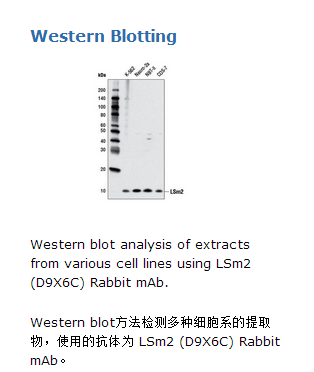 LSm2 (D9X6C)Antibody 能够检测内源性的 LSm2总蛋白水平。该单克隆抗体是经由合成的围绕人LSm2蛋白Gly64位点的氨基酸肽段免疫动物而生产的。LSm蛋白是一类古老的RNA结合蛋白家族的成员,他们在RNA代谢中发挥功能(1,2)。已经鉴定出了两种LSm复合物或环:LSm1-7 和LSm2-8 (1)。胞质LSm1-7复合物参与mRNA降解(3)。LSm2-8复合物是pre-tRNA和rRNA成熟所需要的(4,5),并且他们还能够与U6 snRNA 一起调控pre-mRNA的剪接(6)。最近的研究显示LSm2-8在端粒酶RNA的生物发生中发挥作用(1)。