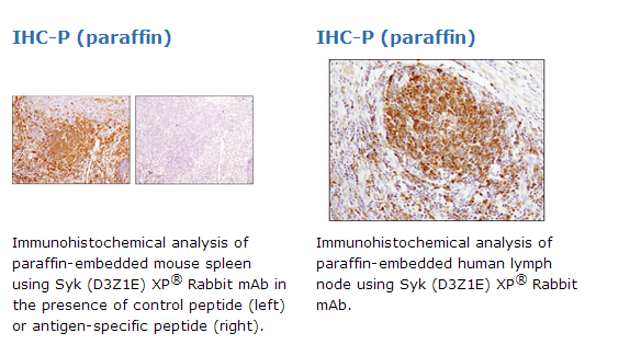 Syk (D3Z1E) XP® Rabbit mAb recognizes endogenous levels of total Syk protein.