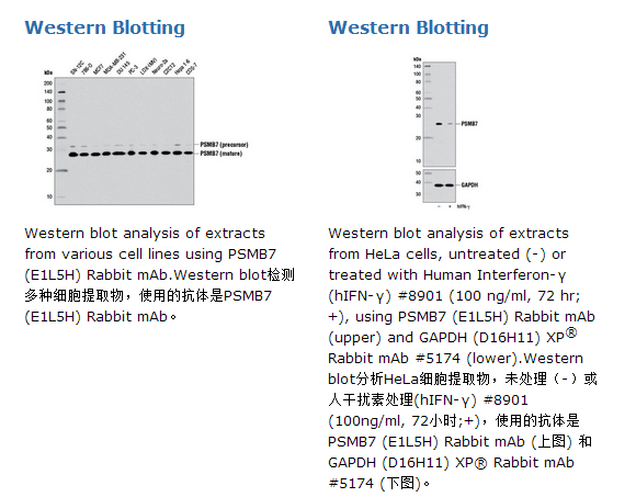 PSMB7 (E1L5H) Rabbit mAb兔单抗识别内源性的总PSMB7蛋白。此抗体与PSMB7的前体和成熟蛋白反应。但与PSMB10无交叉反应性。此抗体经合成与人源PSMB7蛋白的Lys237邻近氨基酸残基序列一致的肽段,免疫动物产生。26S蛋白酶体是一种高丰度,大小约2 MDa的复合物,它具有泛素蛋白酶体途径的蛋白水解臂。它主要由两种亚型复合物组成,19S调节颗粒(RP)和20S催化核心颗粒(CP),在许多情况下RPs会覆盖CP的任一末端。CP由包含催化位点的2种堆积β-环组成,每一种β-环由7种亚基组成(β1-7),且两侧包含两个分别由七个亚基构成的α环 (α1-7).。因此,20S CP 的结构为α1-7β1-7β1-7α1-7。RP包括了一个底部和一个盖子。部分底部由ATPases的六角环组成,功能为打开底物蛋白和打开α-亚基交错的N-末端片段的闸门,从而使得未折叠的底物进入催化部位。盖子主要起特异性识别泛素信号的作用(1)。除了19S帽子之外,其他的蛋白和复合物,例如蛋白酶体活化因子28 (PA28/11S),与20S的筒状末端结合,从而促进闸门的开放和激活。此外,蛋白酶体相关的DUBs和E3s能够改变底物嵌合的多泛素链,这可能调节了它们对降解的敏感性(2)。核心颗粒由它内部的三种催化活性类型构成:糜蛋白酶样、胰蛋白酶样和半胱天冬酶样活性,由组成性表达的PSMB5 (β5/MB1/X/LMPX/Macropain epsilon链), PSMB7 (β2/Z/Macropain 链 Z)和PSMB6 (β1/Y/LMPY/Macropain delta 链)亚基分别组成。这些催化亚基属于N-末端亲核(Ntn)水解酶家族,并有标志性的单一残基活化位点。每一种蛋白水解亚基的N-末端苏氨酸提供催化的亲核体(在侧链上)和主要的质子接受体(在主要的链N-末端)。β-催化亚基由N-末端前肽合成,通过限制性蛋白水解暴露于催化的苏氨酸残基,在蛋白酶体发生的最后被去除(3)。免疫应答的免疫细胞中,组成性地表达PSMB6、PSMB、PSMB5亚基被3种高度同源的诱导β-亚基:PSMB9 (β1i/LMP2/RING12), PSMB10 (β2i/MECL-1/LMP10) 和 PSMB8 (β5i/LMP7/RING10)分别替代,从而形成免疫蛋白酶体(4,5)。PSMB7由IFN-γ在蛋白水平小调,并由PSMB10/MECL-1取代,为了改变蛋白酶体的蛋白水解特异性,从而为内源性抗原提供适当的免疫处理(6)。研究者已经证实PSMB7的表达在人结肠腺癌中上调,此外,研究表明高表达的PSMB7可能作为乳腺癌愈后标志(7,8)。