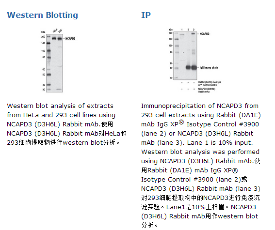 NCAPD3 (D3H6L) Rabbit mAb可以识别内源性总的NCAPD3蛋白。单克隆抗体由合成肽段免疫动物产生,该肽段与人NCAPD3蛋白羧基末端附近氨基酸一致。Structural maintenance of chromosomes 2 (SMC2) 和4 (SMC4)是凝缩蛋白复合物亚基能让染色质在细胞分裂后期向两个相反方向迁移时凝结(1,2)。凝缩蛋白是染色质的一个通用调控因子,可能调控基因表达和DNA修复。凝缩蛋白复合物亚基SMC2和SMC4形成了一个能够在染色质凝聚中发挥重要作用的有功能的ATPase,同时有三个辅助亚基能够调控ATPase功能。研究发现高等真核细胞中,SMC2和SMC4都属于两个不同的凝缩蛋白复合物(condensin I 和 II)。凝缩蛋白I 含有辅助亚基NCAPD2, NCAPG,和 NCAPH,凝缩蛋白II含有相关的辅助蛋白NCAPD3, NCAPG2,和NCAPH2 (1,2). 每个凝缩蛋白复合物在细胞周期中表现了不同的定位模式,也提供了不同的功能(3-5)。Structural maintenance of chromosomes 2 (SMC2) 和4 (SMC4)凝缩蛋白I分裂间期位于细胞质中,在分裂前期核膜破裂后与染色质结合。凝缩蛋白I对于cohesin完全从染色质臂脱离,染色质缩短和前中期到中期的正常进行是必要的。凝缩蛋白I基因突变会导致分裂后期纤维持续存在引起胞质分裂缺陷。凝缩蛋白II在分裂间期位于细胞核,直到分裂早期才与染色质集合并一直持续到分裂末期。凝缩蛋白II对于起始早期的染色质凝集是必不可少的。凝缩蛋白II的基因突变会导致染色质的不完全分离产生大量anaphase bridges。凝缩蛋白II复合物亚基D3(NCAPD3)在凝缩蛋白II与染色质连接时发挥了关键作用,并调控染色质凝聚(6,7)。NCAPD3蛋白包括HEAT重复区,该区域与单甲基化组蛋白H4Lys20结合,这是一个组蛋白标记能够抑制有丝分裂且对于DNA修复和染色质凝聚非常重要(6)。组蛋白去甲基化酶PHF8与染色体分离会增加组蛋白H4 Lys20的单甲基化水平,提高甲基转移酶SET8的表达水平,导致分裂期NCAPD3和凝缩蛋白II与染色体结合增强(6)。NCAPD3的Thr1415被CDK1激酶(cdc2)磷酸化会募集PLK1激酶,PLK1激酶会高度磷酸化凝缩蛋白II并促进有丝分裂染色体的组装(7)。