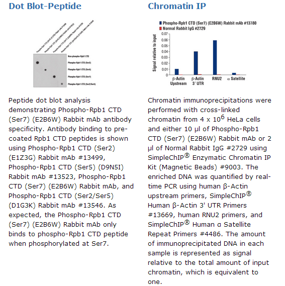 Phospho-Rpb1 CTD (Ser7) (E2B6W) Rabbit mAb recognizes endogenous levels of Rpb1 protein only when the carboxy-terminal domain (CTD) heptapeptide repeat [Tyr1, Ser2, Pro3, Thr4, Ser5, Pro6, Ser7] is phosphorylated at Ser7. This antibody does not cross-react with Rpb1 CTD phosphorylated at Ser2 or Ser5.