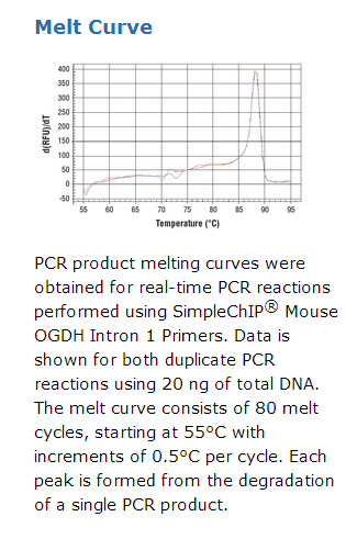 SimpleChIP® Mouse OGDH Intron 1 Primers contain a mix of forward and reverse PCR primers that are specific to intron 1 of the mouse 2-oxoglutarate dehydrogenase (OGDH) gene. These primers can be used to amplify DNA that has been isolated using chromatin immunoprecipitation (ChIP). Primers have been optimized for use in SYBR® Green quantitative real-time PCR and have been tested in conjunction with SimpleChIP® Enzymatic Chromatin IP Kits #9002 and #9003 and ChIP-validated antibodies from Cell Signaling Technology®.
