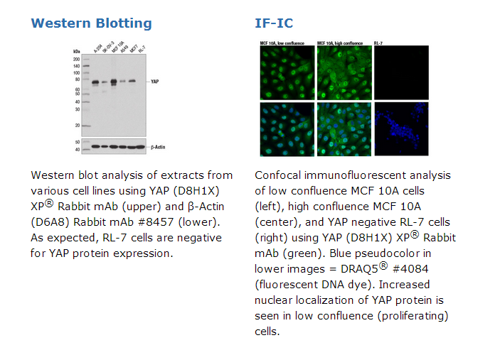 YAP (D8H1X) XP® Rabbit mAb recognizes endogenous levels of total YAP protein.
