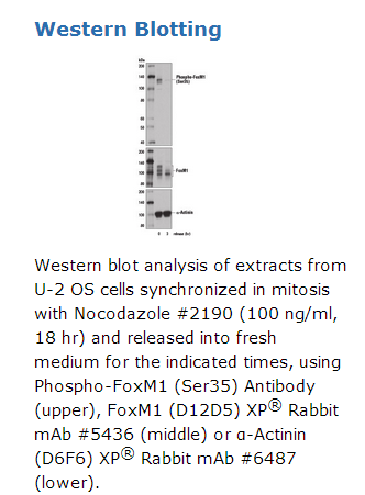 Phospho-FoxM1 (Ser35) Antibody recognizes endogenous levels of FoxM1 protein only when phosphorylated at Ser35.