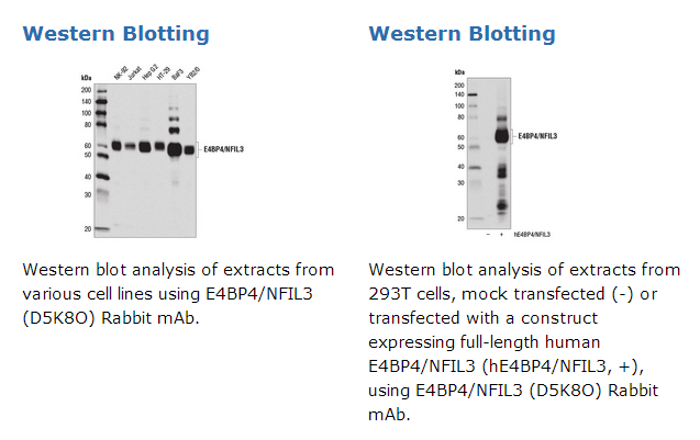 E4BP4/NFIL3 (D5K8O) Rabbit mAb recognizes endogenous levels of total E4BP4/NFIL3 protein.