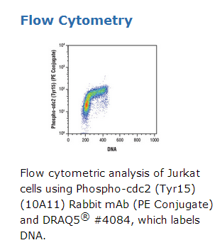 This Cell Signaling Technology antibody is conjugated to phycoerythrin (PE) and tested in-house for direct flow cytometry analysis in human cells. The antibody is expected to exhibit the same species cross-reactivity as the unconjugated Phospho-cdc2 (Tyr15) (10A11) Rabbit mAb #4539.