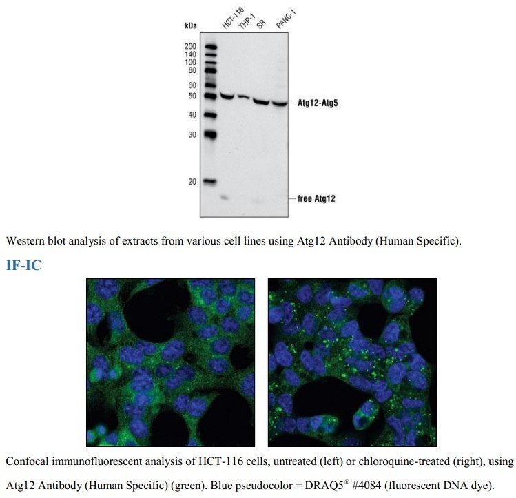 Atg12 Antibody(人特异性的)能够检测内源性的游离Atg5和与Atg12结合的Atg5的总蛋白。该单克隆抗体是通过合成肽免疫动物制备的,这些合成肽的序列与人源Atg12邻近氨基末端残基相一致。抗体通过多肽亲和色谱法纯化。自噬是自噬溶酶体降解其所包裹的细胞质内容物的一个分解代谢过程(1,2)。通常情况下,自噬在营养匮乏的时候被激活,但它还与许多生理过程相关,包括生长、分化、神经退行性疾病、感染和癌症(3)。自噬的分子机制主要在酵母中发现的,并称之为自噬相关基因。自噬体的形成涉及一个泛素样连接体系,其中Atg12和Atg5共价结合,并定位到自噬体囊泡中(4-6)。上述连接反应由泛素E1样连接酶Atg7和E2样连接酶Atg10介导(7,8)。