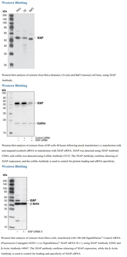 XIAP Antibody detects endogenous levels of total XIAP protein. The antibody does not cross-react with other inhibitors of apoptosis.