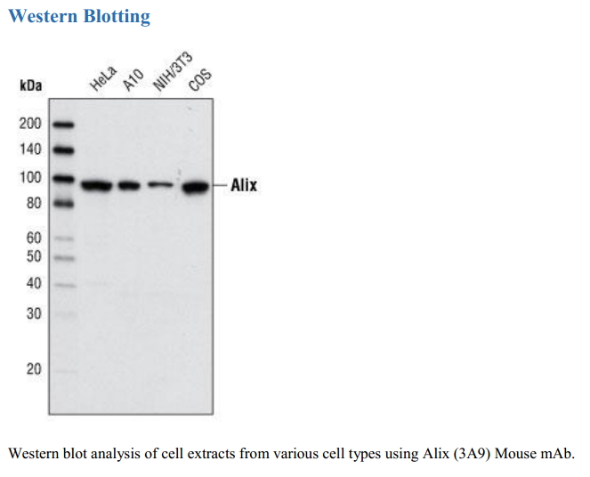 Alix (3A9) Mouse mAb 鼠单抗能够检测内源Alix总蛋白。该单克隆抗体是采用人源全长Alix蛋白来免疫动物而获得。
