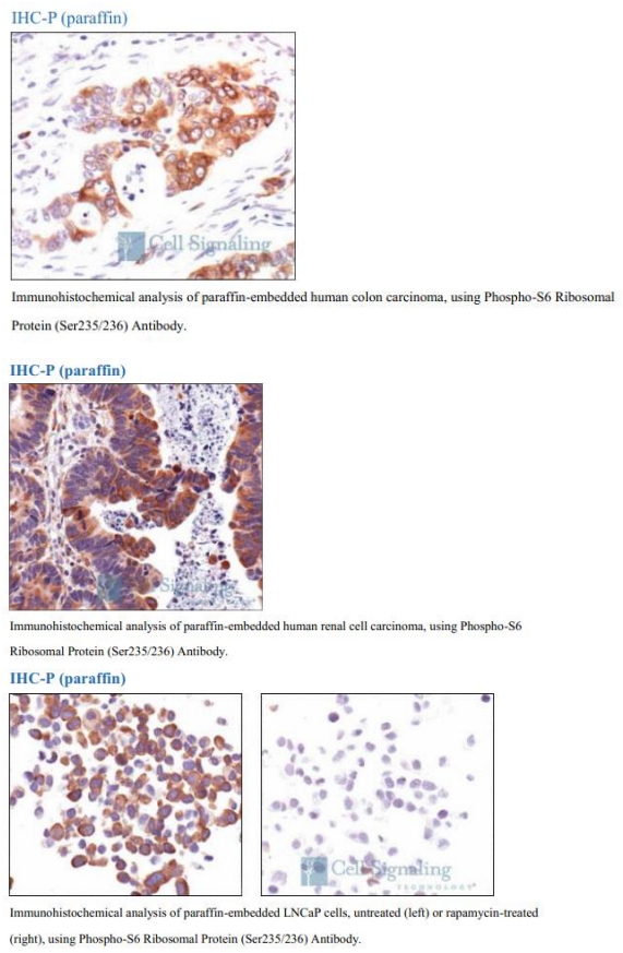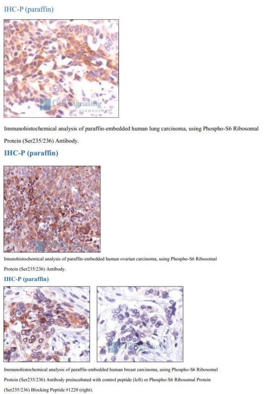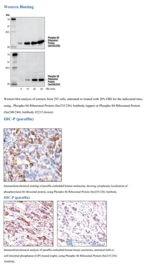 Phospho-S6 Ribosomal Protein (Ser235/236) Antibody检测仅在serine 235和236位点磷酸化的内源性核糖体S6蛋白。该抗体不能检测其它位点磷酸化的核糖体S6蛋白。通过人工合成人源核糖体S6蛋白Ser235和Ser236位点周围序列相应的磷酸化片段去免疫动物从而制备多克隆抗体。通过蛋白A和多肽亲和层析纯化抗体。
