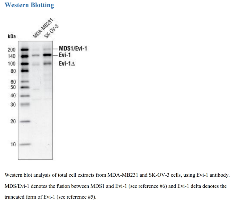 Evi-1 (热带病毒整合位点1)最初是从小鼠髓系白血病中病毒的普遍整合位点鉴定而来。它通过染色体的易位和倒置而参与了骨髓相关疾病(1)并在实体肿瘤的形成中发挥作用(2)。Evi-1是一个锌指转录因子,在动物的发育过程中起了重要作用(3)。由于利用不同的5‘端 (4)可变剪切(5)使其有多重形式,可变剪切导致了在正常组织中产生与MDS1融合的蛋白(6)。