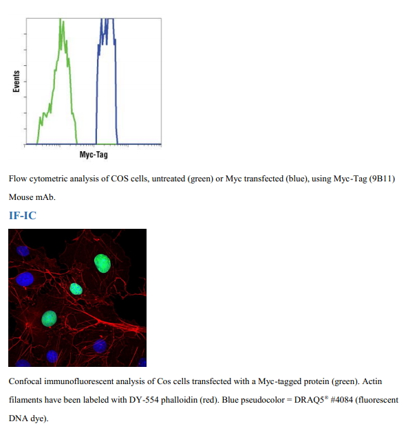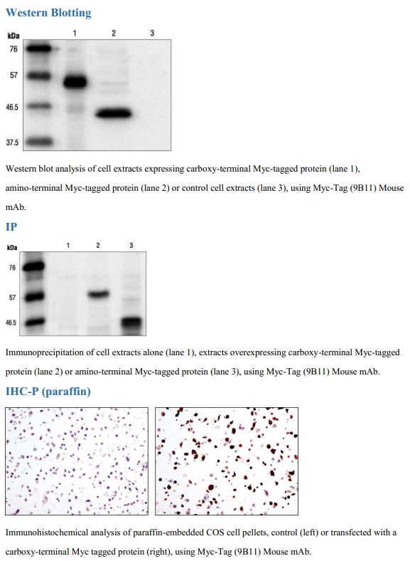 Myc-Tag (9B11) Mouse mAb 可以检测细胞中包含Myc标为标签的蛋白。此抗体可以识别转染细胞靶蛋白在氨基或羧基末端融合的Myc标签 。单克隆抗体是采用与人类c-Myc (EQKLISEEDL)的410-419残基相对应的合成肽段免疫动物而生产的。在免疫印迹、免疫沉淀和免疫染色等技术中,表位标签用于标记和检测蛋白。由于它们的体积很小,它们一般不会影响标记蛋白的生化特性。Myc标为标签在细菌、酵母和哺乳动物细胞系统中广泛应用于检测重组蛋白的表达(1)。