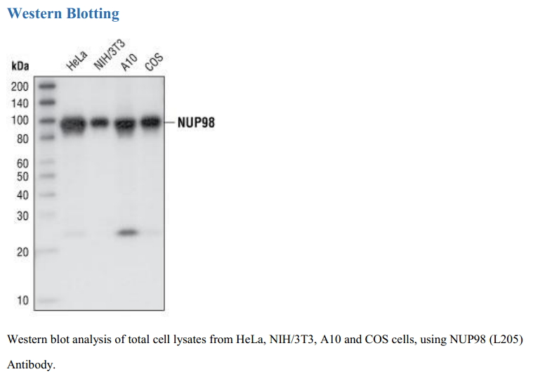 NUP98 (L205) Antibody检测内源性NUP98蛋白。通过人工合成人源NUP98蛋白Leu205位点周围相应的多肽片段去免疫动物从而制备出多克隆抗体。通过蛋白A和多肽亲和层析纯化抗体。NUP98 (nucleoporin 98 kDa)是核孔复合物的一个成员。首先以三种不同的前体表达,随后这个前体经历自动剪切产生一个共同的氨基端98 kDa大小的多肽(NUP98)和羧基端6, 96 (NUP96)和88 (p88) kDa大小的多肽(1-2)。NUP98蛋白在它的氨基端含有FG和GLFG重复结构域和它的羧基端含有一个RNA结合域(3)。NUP98基因定位在chromosome 11p15.5,该区域在白血病中频繁地重新排列。迄今,对于NUP98蛋白已经确认15个融合伴侣 (4-5)。