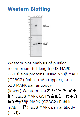 p38β MAP Kinase (C28C2) Rabbit mAb兔单抗能够检测内源性总p38 MAPK激酶蛋白。该抗体不能与其他的p38 MAPK亚型发生交叉反应。该单克隆抗体是采用合成的与p38β MAPK蛋白羧端周围残基的合成肽段免疫动物而获得。