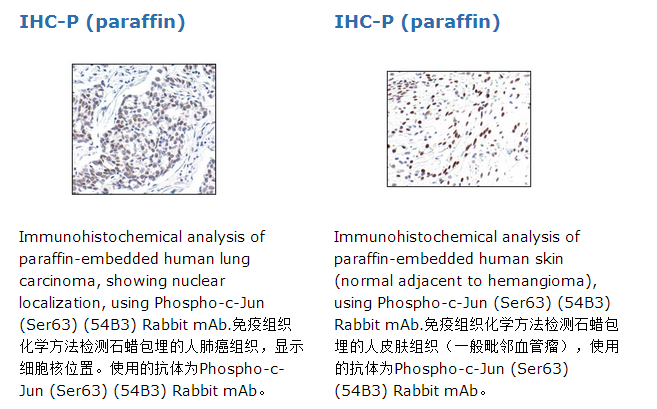Phospho-c-Jun (Ser63) (54B3) Rabbit mAb 兔单抗能够检测内源性Ser63位点磷酸化的c-Jun蛋白水平。该单克隆抗体是采用合成的与人源c-Jun蛋白Ser63位点周围相一致的磷酸化肽段免疫动物而产生的。