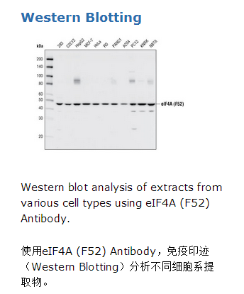 eIF4A (F52) Antibody detects endogenous levels of total eIF4A1, eIF4A2 and eIF4A3 proteins.