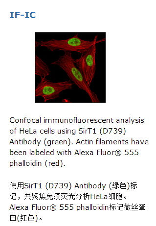 SirT1 (D739) Antibody detects endogenous levels of total SirT1 protein. This antibody does not cross-react with other sirtuin proteins.